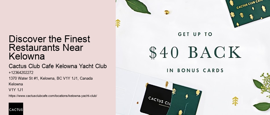 Or, picture yourself enjoying a special themed dinner menu that celebrates local harvests in the fall. Here's how you can ensure every visit counts. With its unmatched lakeside views, you'll find yourself immersed in a setting that's as stunning as it is serene. Text before the meta title text for each paragraph Discover the Finest Restaurants Near Kelowna Text after the meta title text paragraph Cactus Club Cafe Kelowna Yacht Club's celebratory dining options elevate your special occasions with unforgettable culinary experiences.