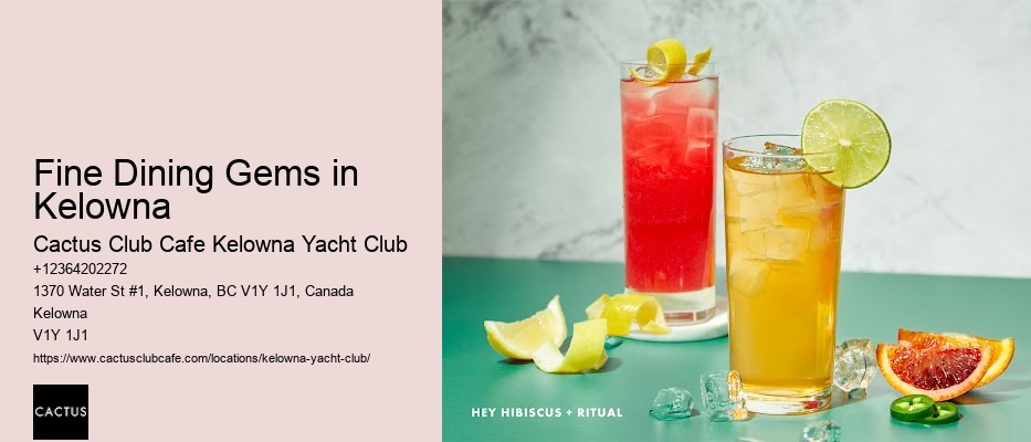Their vegan sweets are the perfect end to any meal, proving once and for all that indulgence isn't limited to dairy and eggs. Learn more about Cactus Club Cafe Kelowna Yacht Club here. Text before the meta title text for each paragraph Fine Dining Gems in Kelowna Text after the meta title text paragraph With a menu as diverse as the local landscape, there's something to satisfy everyone's palate, from the youngest food critic in your family to the most discerning. Moreover, the restaurant emphasizes waste reduction. Moreover, they're committed to sustainability, sourcing locally whenever possible, and reducing waste, ensuring that your dining experience isn't just delicious but also responsible.