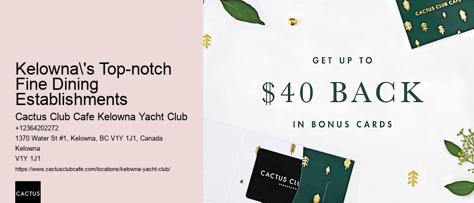 Join us at Cactus Club Cafe Kelowna Yacht Club for these exciting events and promotions. Learn more about Cactus Club Cafe Kelowna Yacht Club here. Text before the meta title text for each paragraph Kelowna's Top-notch Fine Dining Establishments Text after the meta title text paragraph Whether it's a casual lunch or a romantic dinner under the stars, the outdoor seating at Cactus Club Cafe Kelowna Yacht Club caters to your every need. The staff's knowledge about these pairings means you're in good hands. This not only supports local farmers but also ensures that you're enjoying the freshest produce.