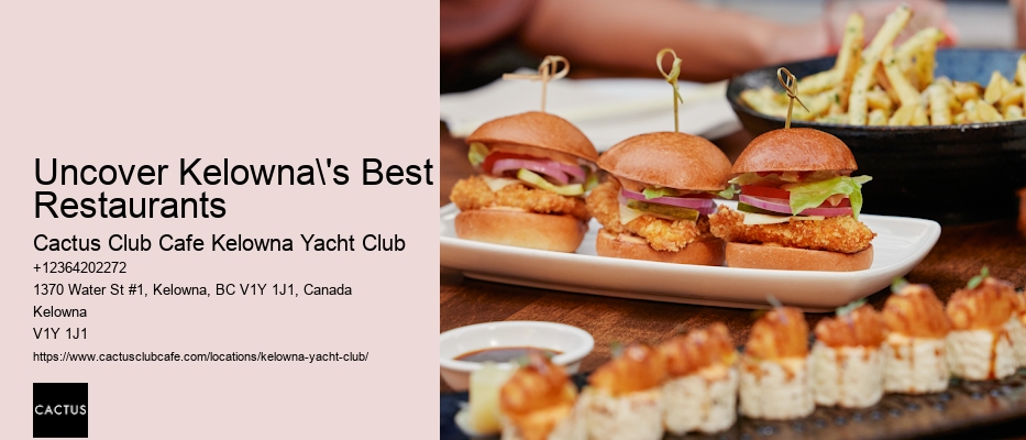 They're experts at tailoring experiences, ensuring your event, no matter its scale, feels intimate and special. Learn more about Cactus Club Cafe Kelowna Yacht Club here. Sign up for the loyalty program to get exclusive access to discounts, special events, and more. And if you're visiting during the warmer months, the outdoor seating area is perfect for letting kids enjoy a bit of fresh air. Text before the meta title text for each paragraph Uncover Kelowna's Best Restaurants Text after the meta title text paragraph You'll notice the thoughtful touches that make the space unique – from the art-adorned walls that add a splash of personality to the meticulously set tables that speak of attention to detail. It's not just a meal; it's a moment, suspended in the beauty of nature's backdrop.
