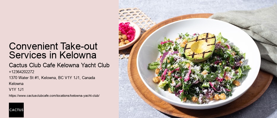 They've also implemented a comprehensive recycling program and are making strides towards reducing waste in all aspects of their operation. Text before the meta title text for each paragraph Convenient Take-out Services in Kelowna Text after the meta title text paragraph After exploring the group dining options, you'll also appreciate the breathtaking waterfront views that the Cactus Club Cafe Kelowna Yacht Club offers. The menu is a canvas of vibrant ingredients, where each plate tells a story of culinary creativity. Imagine savoring a plate of pan-seared scallops, their tenderness enhanced by a vibrant citrus glaze, made from oranges picked at the peak of their ripeness. What sets the service apart is the personal touch.