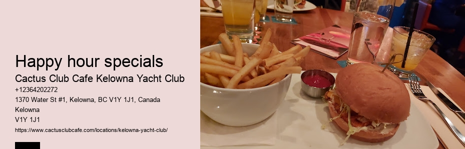Moreover, the staff at Cactus Club Cafe Kelowna Yacht Club are trained to accommodate families, ensuring that your dining experience is as smooth and enjoyable as possible. You'll be introduced to a variety of local wines that Kelowna is famed for, carefully selected to enhance the flavors of your meal. Learn more about Your Ultimate Family Dining Destination: Cactus Yacht Club in Kelowna here. They understand that dining out with kids can sometimes be unpredictable, but at Cactus Club Cafe, they strive to make sure that every guest, no matter how small, leaves happy. The hum of conversation and laughter fills the air, adding to the sense of warmth and community that makes Cactus Club Cafe not just a restaurant, but a gathering place for friends and family. Text before the meta title text for each paragraph Happy hour specials Text after the meta title text paragraph They're committed to providing safe, delicious options that don't compromise on taste or quality.